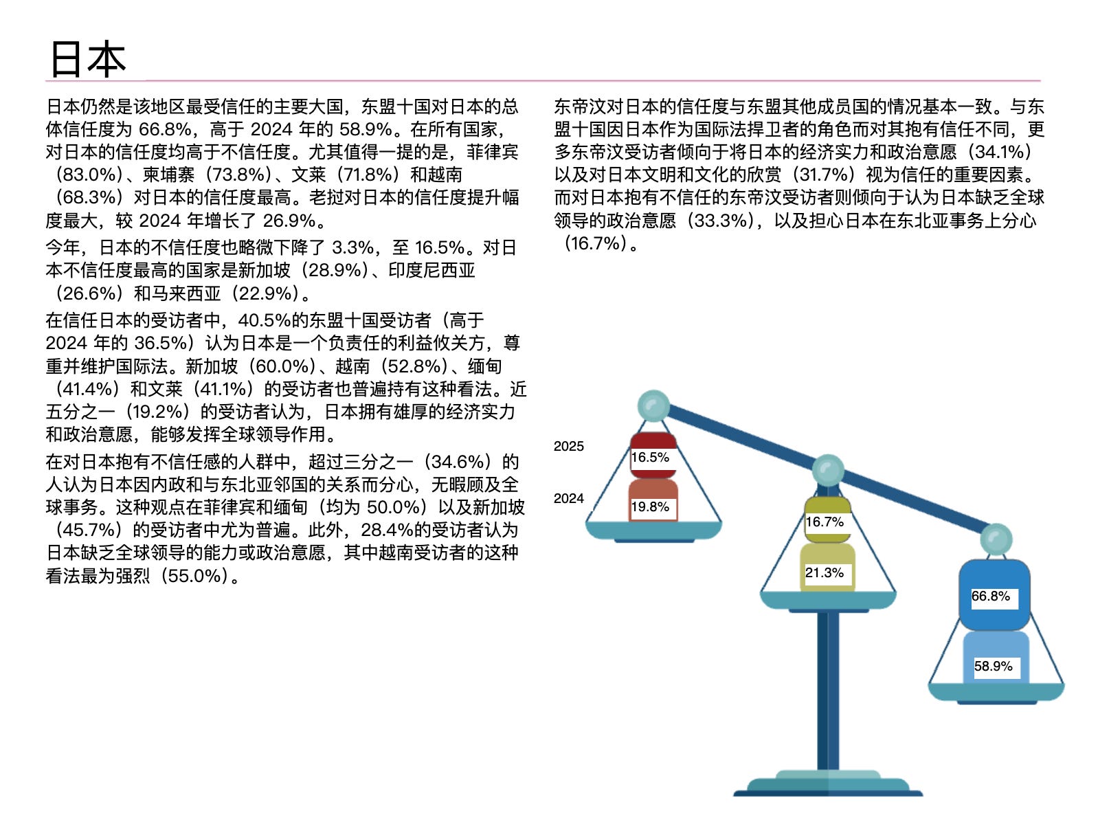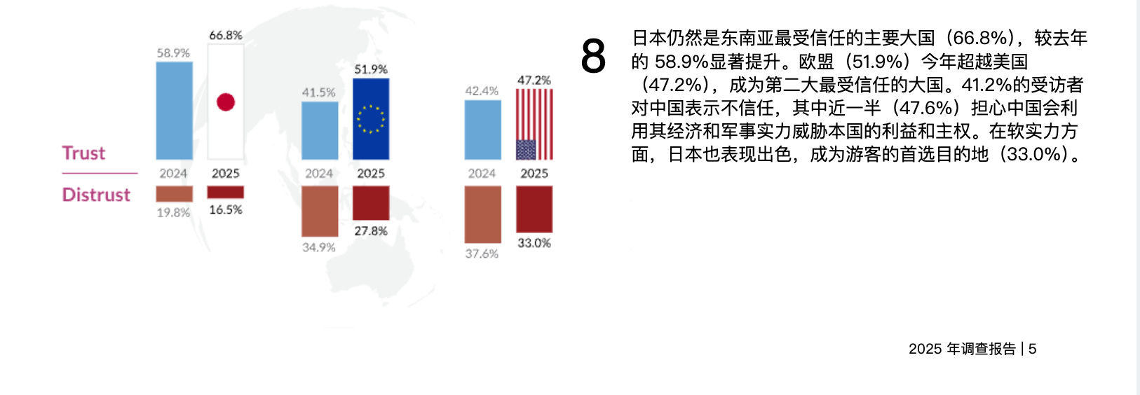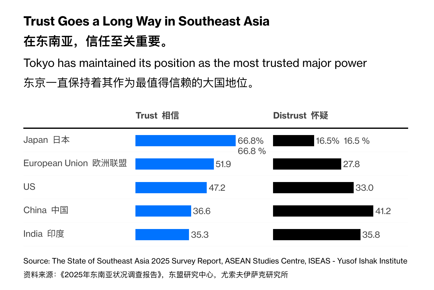 这是ISEAS-Yusof Ishak Institute发布的《2025年东南亚状况》调查报告。几个结果:日本是该地区最受信任的大国,信任度从去年的58.9%升到了66.8%。东南亚看重日本对国际法的尊重和经济实力。41.2%的受访者对中国表示不信任,很多人担心中国会利用经济和军事实力威胁他们国家的主权。