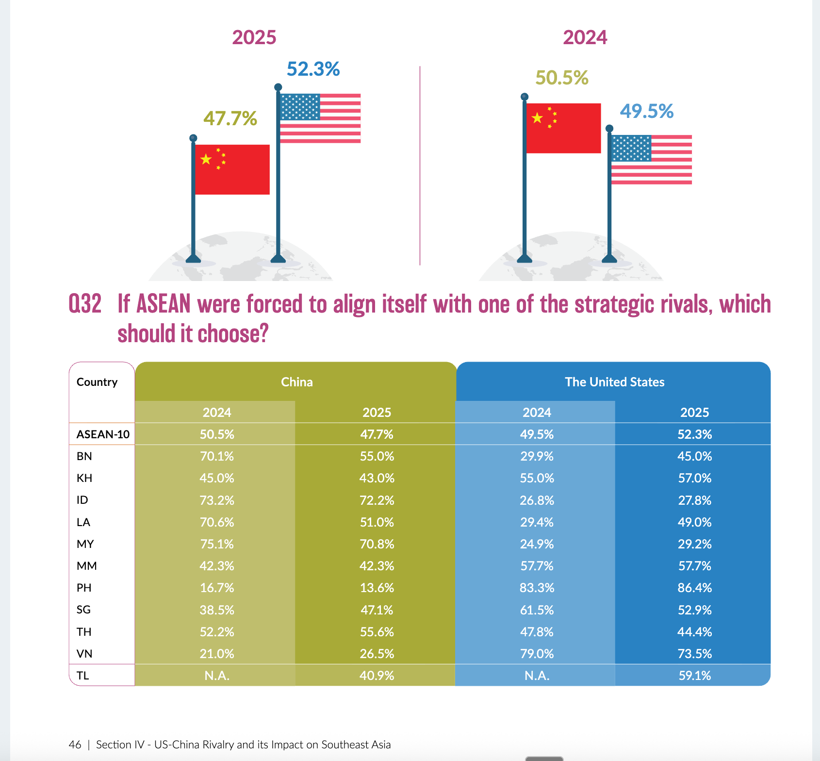之所以值得一读,是因为它调研了东南亚十国加上东帝汶的 2000 多位政商学界精英。今年的数据里藏着一个“剧情反转”:在长达几年的“中美角力”叙事中,大家通常觉得中国在东南亚的影响力是压倒性的,但当被问到“如果非要在中美之间选边站”这个得罪人的问题时,今年有 52.3% 的受访者选择了美国,而选择中国的比例滑落到了 47.7%。这是自 2020 年以来,美国首次在这个指标上反超中国。