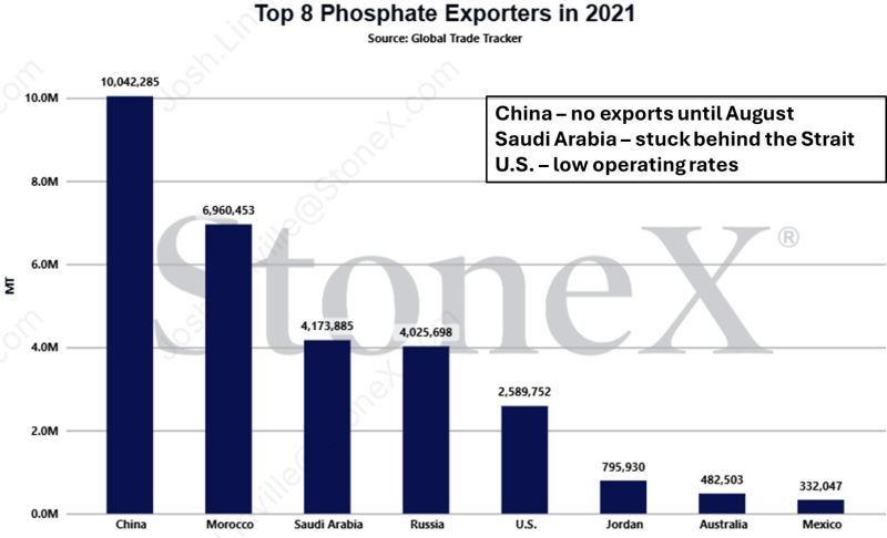 霍尔木兹海峡这条窄窄的水道,正常年份承担着全球约三分之一的化肥海运贸易量。根据美国农业局联合会(AFBF)的分析,受该海峡影响的国家合计占全球尿素出口量的近49%、氨出口量的约30%(AFBF Market Intel, 2026年3月)。全球前十大尿素出口国中,有三个在波斯湾里面;前十大氨出口国中也有三个。而沙特阿拉伯——全球前五大磷肥出口国之一——同样在海峡后面。