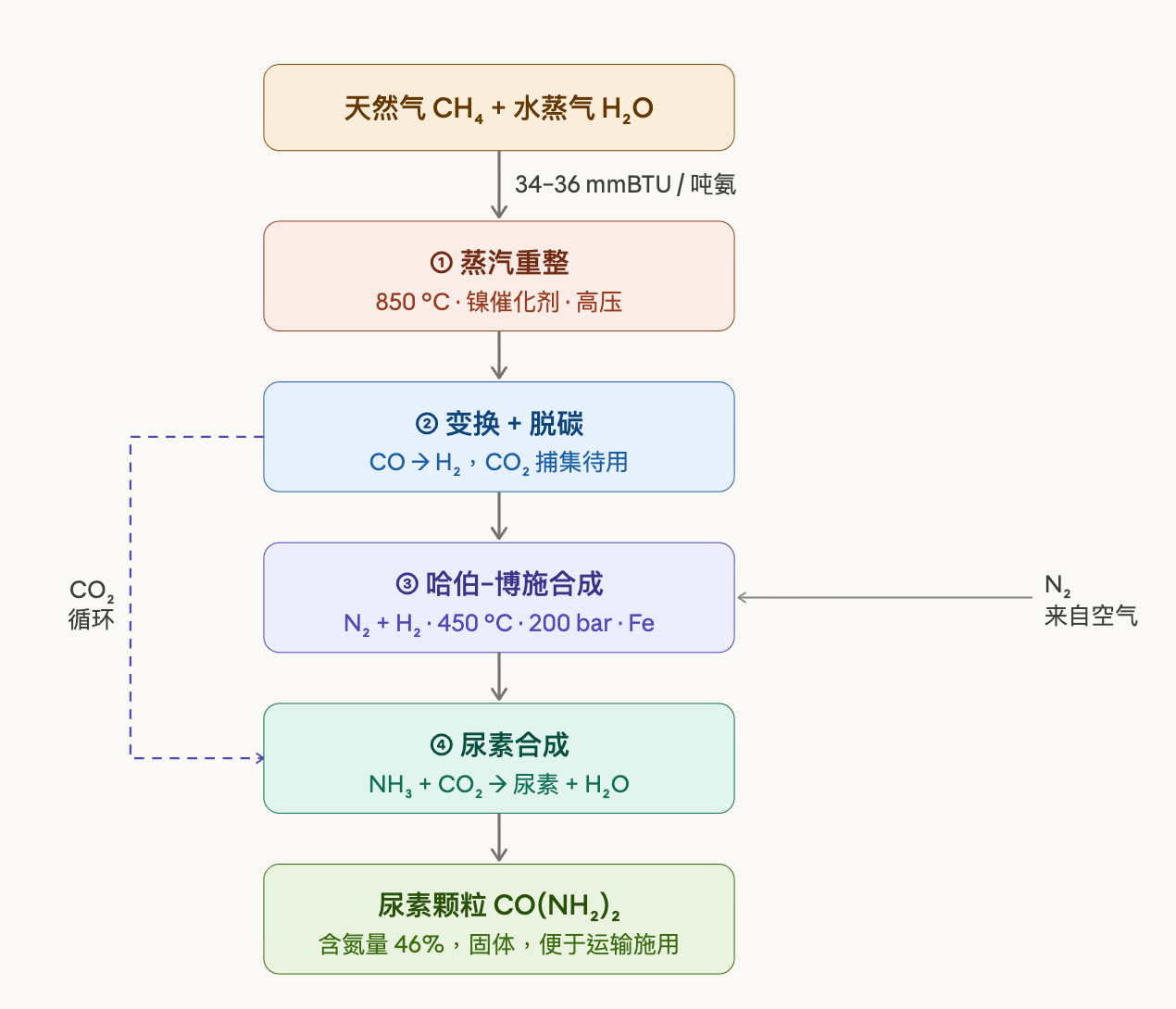 生产一吨氨大约需要36个mmBTU的天然气。氨再经过化学转化,变成尿素——一种含氮46%的白色颗粒,方便运输、方便施用,是全球用量最大的氮肥。去花市或者超市里买花时,都会附带赠送一小包白色颗粒,这就是尿素。