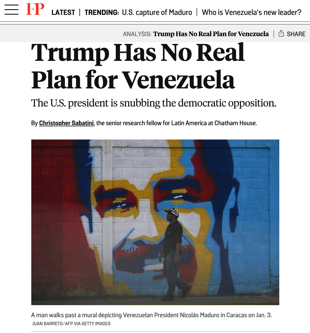哥们观点极其直接:懂王对委内根本没有plan(连“pla”都没有——这是老友记的梗)。没有路线图,没有制裁微调,没石油外交,没难民政策,没有战略,nothing。只有口号。中国这会儿正偷着乐呢。