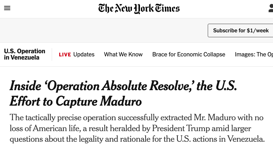 从价格走姿来看,政权更迭这件事早就被内部人士预料到,并且提前布局了(这件事情有太多证据了。其中,当天抓捕,纽约时报当天就发出的全部逮捕内幕文章,从去年 CIA 是怎么布局的,到具体怎么狡兔八窟地抓到了马杜罗,再到具体怎么布置线人,全都事无巨细。这种深度的稿子,显然不可能是当天现写的,只能是提前备好,就等行动一发生立刻发出来。)