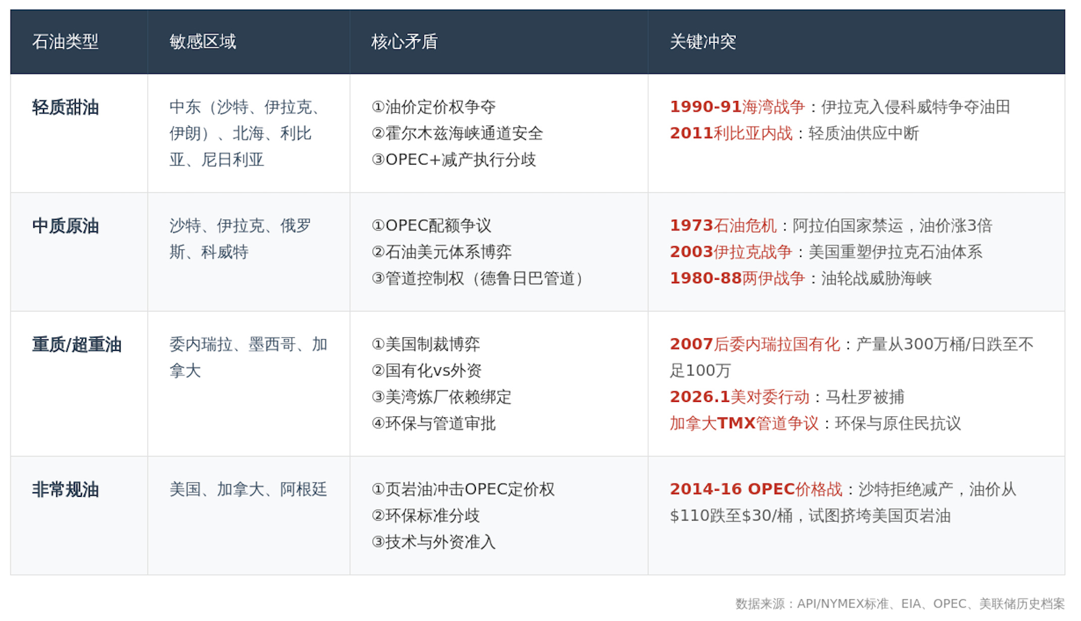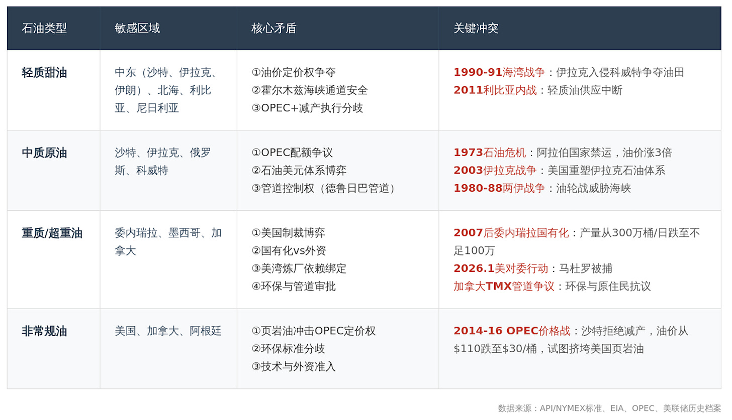 要真正理解委内瑞拉石油的价值和局限,**一个更有用的研究方式是:先搞清楚世界上到底有几种石油,每种石油的特性是什么,以及每种石油和地缘政治的关系。**比如,围绕某种石油,哪些国家是敏感区域?历史上发生过哪些相关的战争、代理人战争或军事行动?